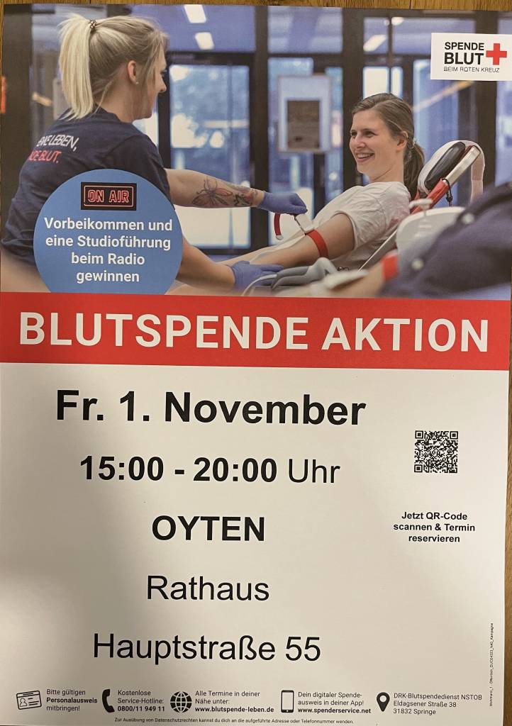 Seid dabei, in der Zeit von 15.00 Uhr - 20.00 Uhr wartet das DRK im Rathaus der Gemeinde Oyten auf euch.