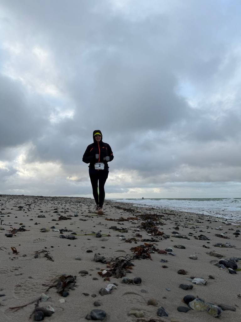 Das wollte Wiebke Brinkmann auch und fuhr zum Wettkampf nach Fehmarn. Dort wurde der erste "Rund um Fehmarn Ultra" veranstaltet. 54 Kilometer im Uhrzeigersinn um die Insel. Der Großteil der Strecke führte über Trails, oft direkt am Strand und wenn es nicht anders ging auch über Asphalt. Wiebke musste am 31. früh raus, der Startschuß fiel um 5:30. Passend zur Dunkelheit und 1° Grad stellte sich noch Schneeregen ein. Wie um diese Jahreszeit auf den Inseln üblich, herrschte kräftigter Wind, der den Läufern alles abverlangte. Wiebke biss sich durch, beendete als einizge Teinehmerin erschöfpft aber zufrieden ihren letzten Wettkampf des Jahres.