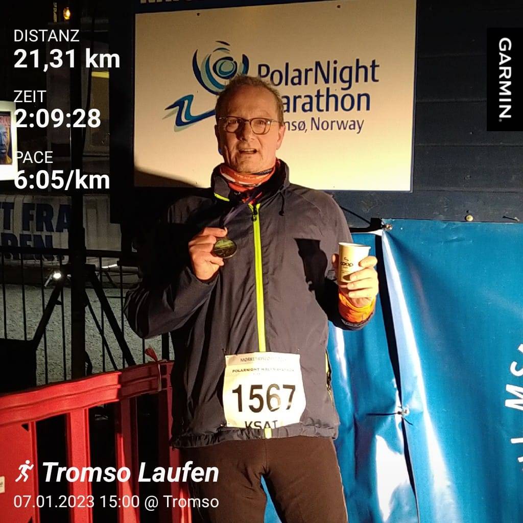Martin Rinn ist in das Sportjahr mit einem eher ungewöhnlichen Lauf gestartet. Er absolvierte in Tromsö (Norwegen) den "Polar Night Halbmarathon". Start war um 15:00; natürlich in dieser Jahreszeit in der Polarnacht. Die Temperaturen waren mit -8 ° eher gemäßigt, doch der kalte Wind verlangte den Läufern einiges ab. In diesem Jahr war das "Geläuf" nicht so gefällig; Martin entschied sich für Spikes. In einer Zeit von 2:09:28 erreichte er das Ziel.
